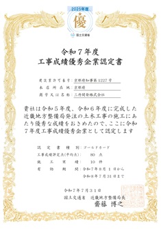 国土交通省近畿地方整備局発注工事において、過去2年に3件以上受注した工事の成績評定平均点が80点以上の企業にのみ認定されるものです。弊社の工事が継続して高い品質を確保していることが証明されました。