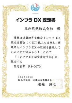 業界のDXを活用した様々な技術による新4Kの取り組みの促進や、地元建設会社におけるデジタル技術活用の人材育成と、インフラDX等の普及促進を目的としてICT施工を実践し、継続的にインフラDXの取り組みを推進している建設会社に贈られる認定書です。